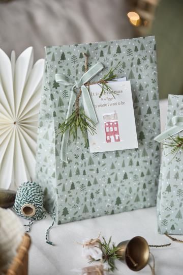 Papiertüte "grüner Weihnachtswald" mit Golddruck.