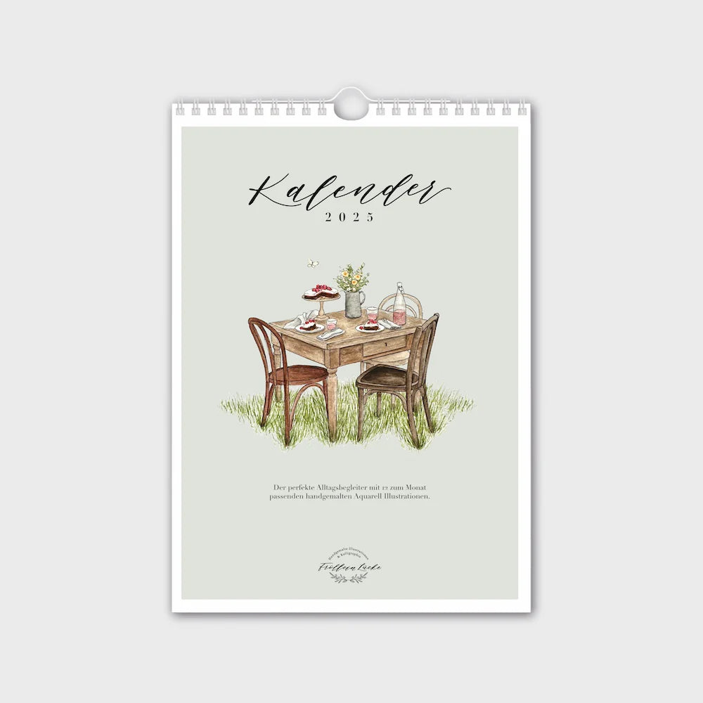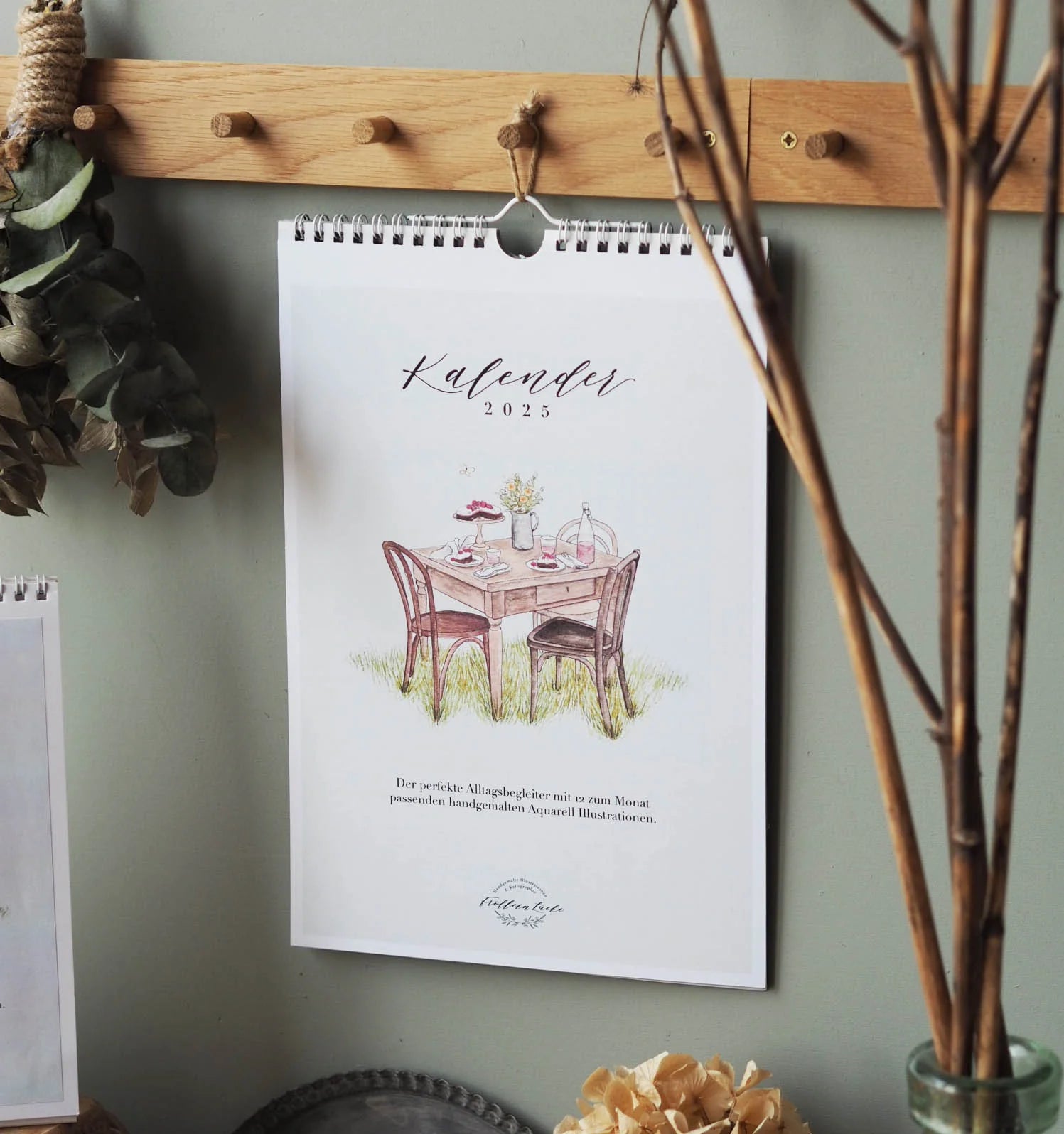 Dieser Kalender ist der perfekte Alltagsbegleiter durch das Jahr 2025 an jeder Wand oder Hakenleiste. Auf jedem Kalenderblatt befindet sich eine zum Monat passende Aquarell Illustration und der von Anna mit Tusche und Feder kalligrafierte Monatsname. Der Kalender ist im Format A4 und wurde mit einer weißen Ringbindung versehen, wodurch man ganz einfach durch die Monate blättern kann.