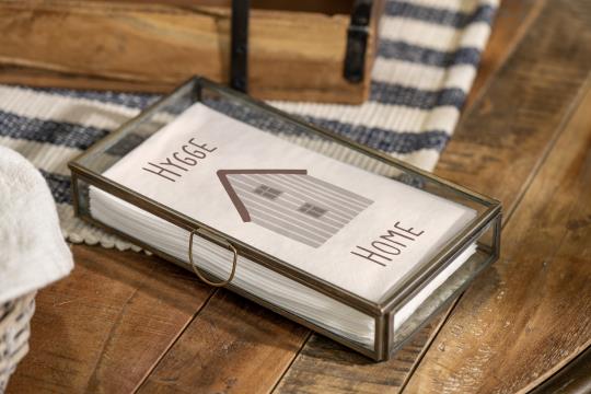 Die Glasschachtel hat die Maße - B: 11,7 H: 4 L: 22,3. Du kannst sie perfekt für Servietten benutzen, oder auch z. B. Deinen Schmuck darin aufbewahren.