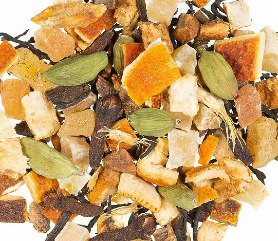 Zutaten: Orangenschalen, schwarzer Tee, kandierte Ananasstücke (Ananas, Zucker), Zimtrinde, kandierte Mangostücke (Mango, Zucker), kandierte Papayastücke (Papaya, Zucker), Nelken(5%), Ingwerstücke(5%), Kardamom(4%), Vanillestücke(1%)
