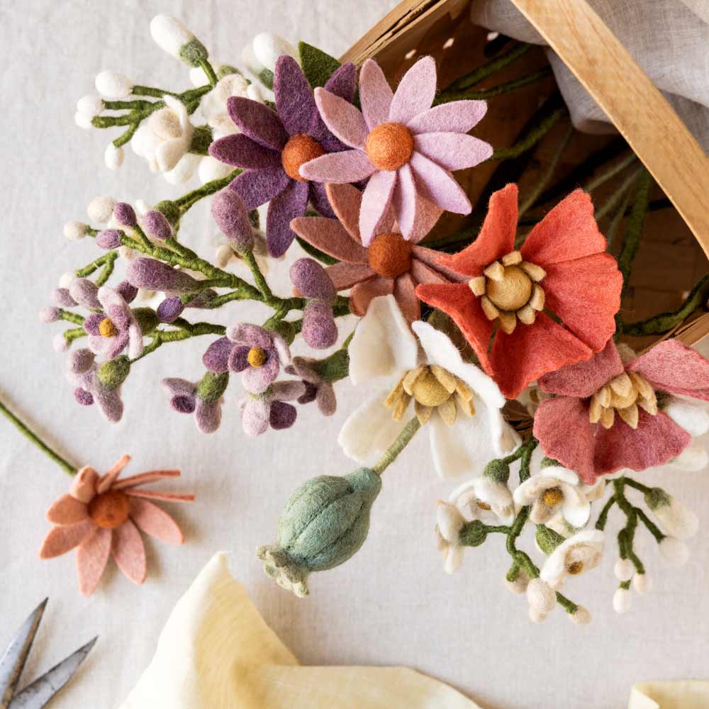 Stelle mehrere Filzblumen in einer schlichten Vase zusammen, kombiniere sie mit Trockenblumen oder Zweigen – so entsteht ein lebendiges Arrangement.