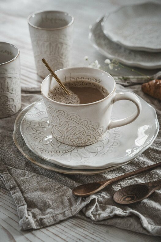 Die wunderschöne, handgeprägte Tasse aus der Geschirrserie "Happiness" von Majas Cottage ist aus Keramik mit einer reaktiven Glasur, die verantwortlich für das einzigartige Mandalamuster auf der Tasse ist und ihr einen rustikalen Charme verleiht. Für alle Fans besonderer Tassen ist dieses Exemplar ein Traum, um darin Gästen einen Kaffee oder Tee zu servieren. Die weisse Glasur kann aufgrund des Brennprozesses und des handwerklichen Prozesses einige Variationen, sowie kleinste Nadellöcher in der Glasur aufweisen. Jedes Stück ist ein Unikat