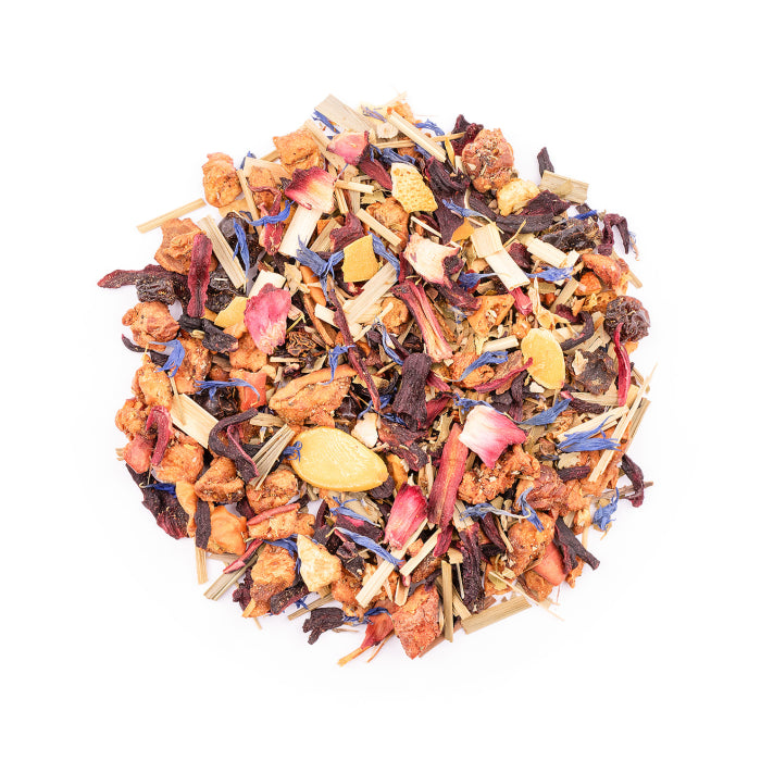 Apfelstücke, Hibiskusblüten, Lemongras, Orangenschalen, Hagebuttenschalen, Weinbeeren, Brombeerblätter, Aroma, Rooibos, Verbenenkraut, Silberlindenblüten, Sternanis, Zimtrinde (1%), Kornblumenblüten, Mandelscheiben, Vanillestücke (0,5%), Nelken